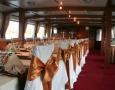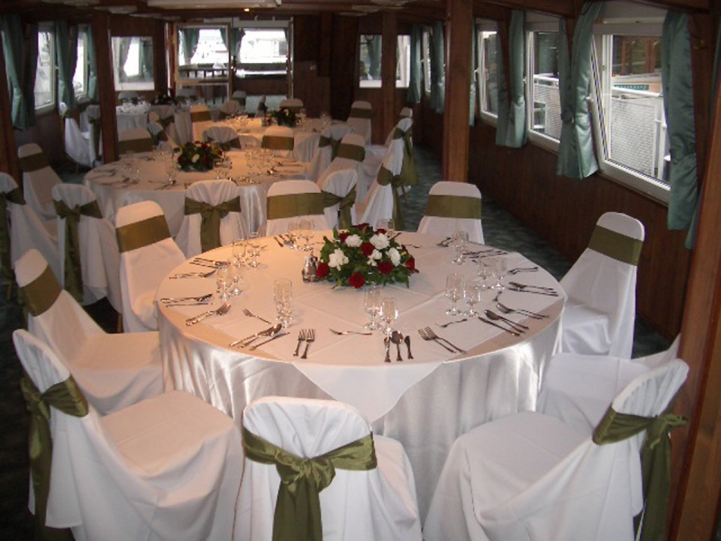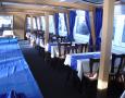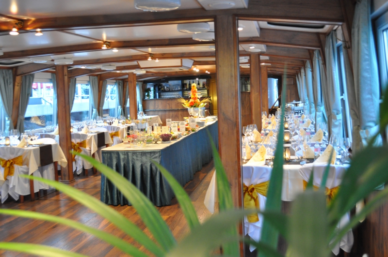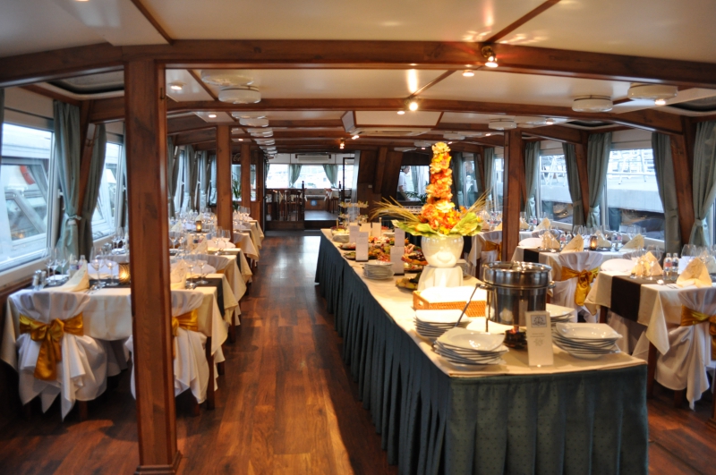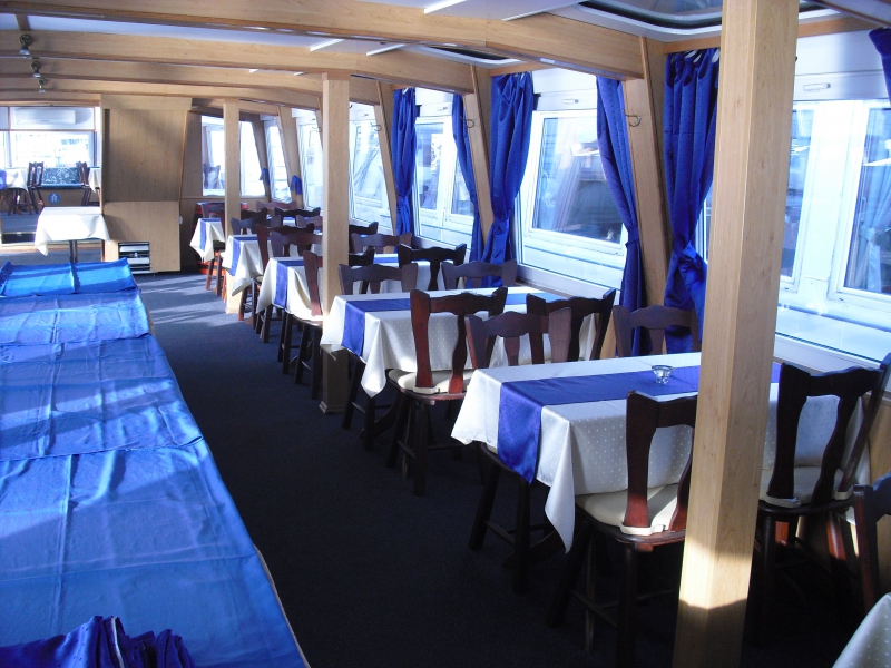 A belső tér fa burkolata és a modern design elemek összhatásában eleganciát és emelkedettséget sugároznak. Vendégeink kényelmét a felszerelt bár, légkondicionált utastér és az egész hajón kihangosított idegenvezetés szolgálja.